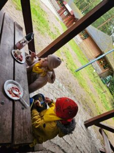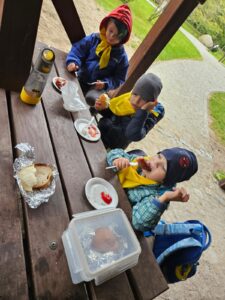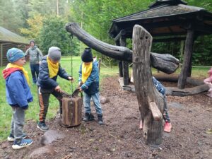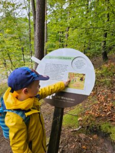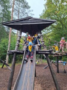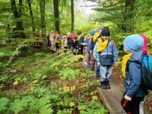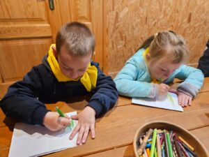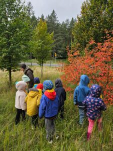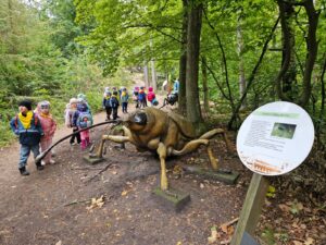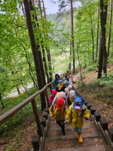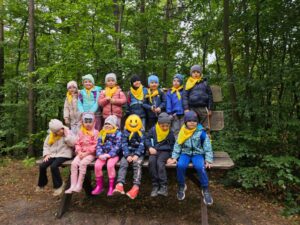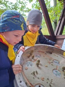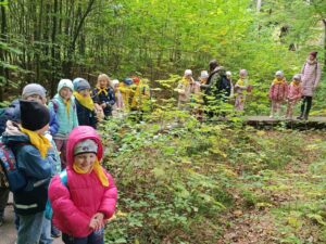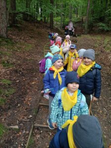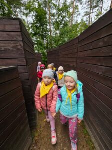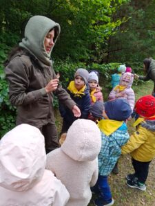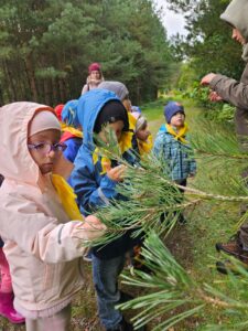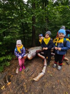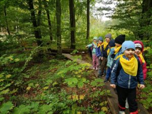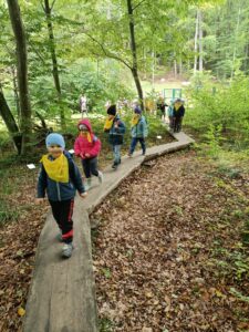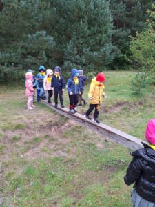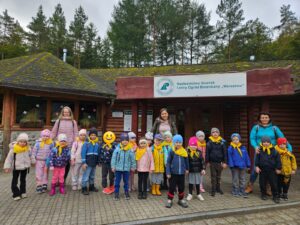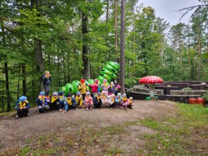 6 października grupa Żabek 🐸 wybrała się na wycieczkę do Leśnego Ogrodu Botanicznego w Marszewie na zajęcia edukacyjne pt. „Rysujemy, malujemy, drzewa poznajemy”. Zajęcia poprowadziła pani Agnieszka Leśniczy, która rozpoczęła zajęcia krótką rozgrzewką na świeżym powietrzu 🤸♂️. Następnie dzieci miały okazję poznać różne gatunki drzew zarówno liściastych🌳, jak i iglastych🌲bezpośrednio w terenie. W części plastycznej zajęć dzieci wykonały piękne prace przy użyciu techniki frotażu, odbijając kształty liści 🍁🍂. Po zakończonych warsztatach udaliśmy się na ognisko🔥, gdzie dzieci z apetytem zajadały pyszne kiełbaski. Kolejnym punktem wycieczki był spacer Szlakiem Alicji w Zaczarowanym Lesie, podczas którego dzieci podziwiały ogromne modele owadów🐜🪳 i grzybów🍄🍄🟫 oraz próbowały znaleźć wyjście z leśnego labiryntu. Dzieci zobaczyły także chatkę drwala i zielarki, co wzbudzło duże zainteresowanie. Pogoda nam dopisała 🌞 więc Żabki mogły jeszcze pobawić się na placu zabaw. Zmęczeni, ale bardzo zadowoleni i pełni wrażeń, wróciliśmy do przedszkola.