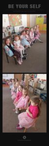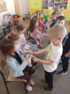 Bardzo miłym momentem było wręczanie przez chłopców kwiatów i drobnych upominków dla koleżanek. Uzupełnieniem tych aktywności była zabawa plastyczna – dziewczynki tworzyły różowe jednorożce, a chłopcy przygotowywali piękne korony dla swoich koleżanek. To był wyjątkowy dzień pełen uśmiechu, życzliwości i wspólnej zabawy.