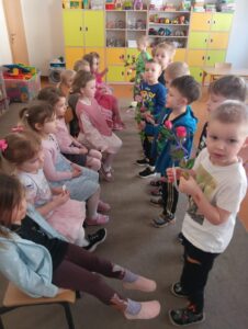 W grupie Jeżyków obchodziliśmy Dzień Kobiet 🌷w radosnej i serdecznej atmosferze. Na początku rozmawialiśmy o tym, czym jest to święto i dlaczego je obchodzimy. Dzieci chętnie wymieniały ważne kobiety w swoim życiu – mamy, babcie, siostry oraz panie z przedszkola.