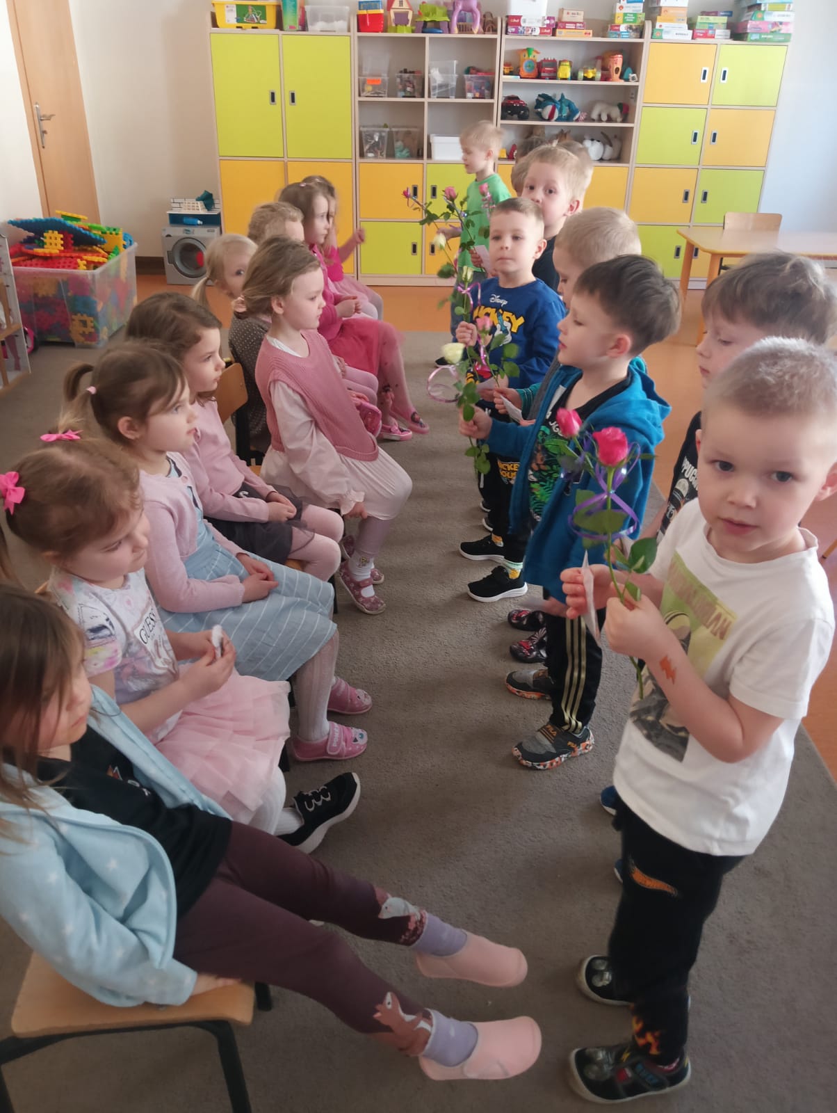 Bardzo miłym momentem było wręczanie przez chłopców kwiatów i drobnych upominków dla koleżanek. Uzupełnieniem tych aktywności była zabawa plastyczna – dziewczynki tworzyły różowe jednorożce, a chłopcy przygotowywali piękne korony dla swoich koleżanek. To był wyjątkowy dzień pełen uśmiechu, życzliwości i wspólnej zabawy.