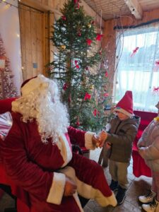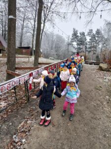 W poniedziałek 24 listopada grupa Żabek 🐸 wybrała się na długo wyczekiwaną wycieczkę do Przywidzidzkiej Osady Świętego Mikołaja, aby spotkać się z Świętym Mikołajem 🎅. Na miejscu powitała nas Pani Mikołajowa wraz z wesołymi elfami, które opowiedziały nam, że zanim spotkamy Świętego Mikołaja 🧑‍🎄, czeka na nas wiele świątecznych zadań.