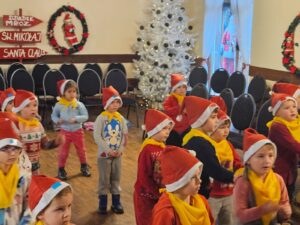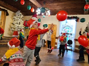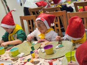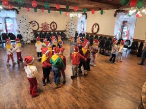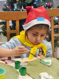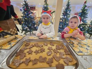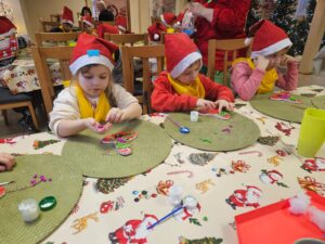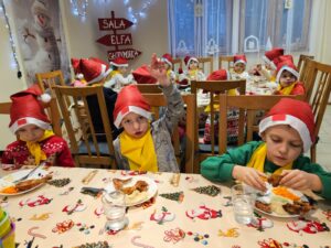 Najpierw wspólnie z elfami zrobiliśmy pachnące pierniczki 🍪. Kolejnym punktem programu było dekorowanie świątecznych ozdób 🎄, tutaj każdy mógł wykazać się kreatywnością i precyzją. W przerwach między zajęciami nie brakowało świątecznej atmosfery, razem z elfami i Panią Mikołajową śpiewaliśmy i tańczyliśmy do świątecznych piosenek 🎶🎤.