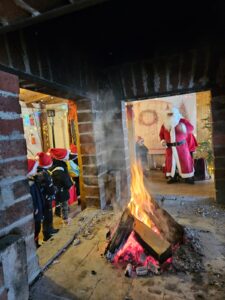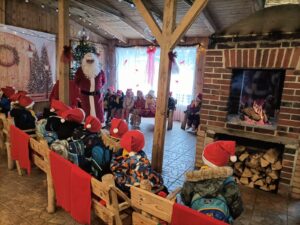 Choć czas mijał, Mikołaj wciąż się nie pojawiał 😉. Dopiero po pysznym obiedzie wyruszyliśmy do domku nad jeziorem. Tam przy kominku, siedział na fotelu Święty Mikołaj 🎅 z akordeonem w ręku. Przywitał nas serdecznie i zagrał kilka kolęd, które śpiewaliśmy razem z nim.