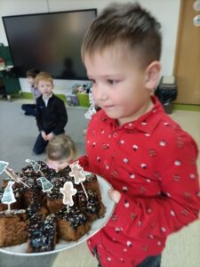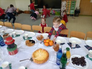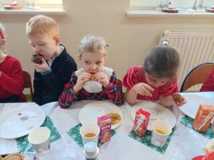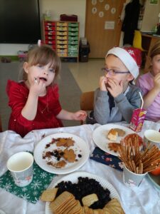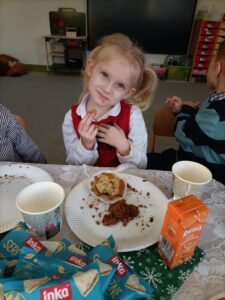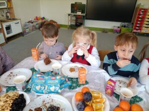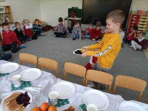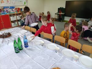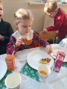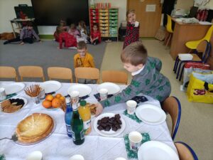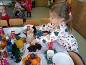 Piątek 19 grudnia był dniem wyjątkowym w naszym przedszkolu. Od rana można było wyczuć uroczysty nastrój, ponieważ z każdej z sal płynęły dźwięki kolęd i pastorałek, a dla podkreślenia ważności tego dnia, wszystkie przedszkolaki przybyły do przedszkola odświętnie ubrane. Rowniez z wielkim zaangażowaniem dzieci z grupy „Żabek” przystąpiły do przygotowania sali i stołu wigilijnego. Zgodnie z tradycją pod białym obrusem znalazło się sianko, a na stole zagościł wigilijne przysmaki. Zanim wszyscy zasiedli do wigilijnego stołu, wspólnie zgromadziliśmy się przy nim, aby zaśpiewać kolędy. Było to bardzo emocjonujące wydarzenie dla niejednej 🐸🐸🐸. Następnie złożyliśmy sobie świąteczne życzenia i zawiedliśmy do stołu. Dzięki naszej wspólnej wigilii wszyscy wprowadziliśmy się w świąteczny nastrój.