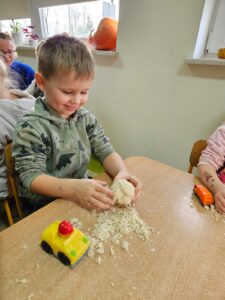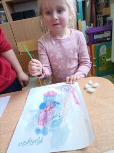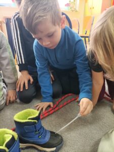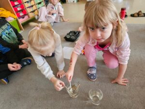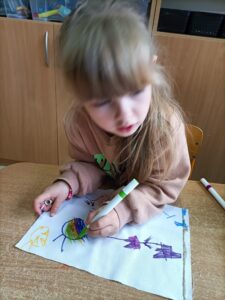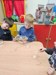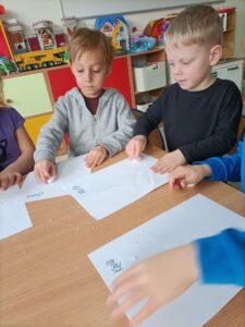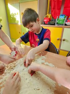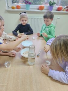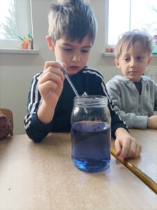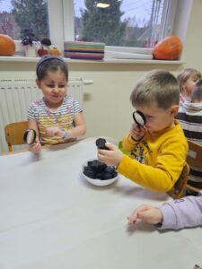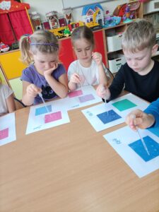 Podczas I etapu projektu nasze Żabki badały różnorodne materiały i poszukiwały odpowiedzi na pytanie: skąd się bierze ropa naftowa? Dzieci zdobywały wiedzę na temat surowców mineralnych w Polsce, dowiadywały się, co jest z czego zrobione, a także poznawały materiały za pomocą wielu zmysłów. Szczególnym zainteresowaniem cieszyło się odkrywanie magii tkanin – ich faktur, właściwości i zastosowań. Podczas zajęć przeprowadzono wiele ciekawych eksperymentów z wodą, olejem, kolorami oraz różnymi materiałami, które rozwijały dziecięcą ciekawość, kreatywność i umiejętność obserwacji.