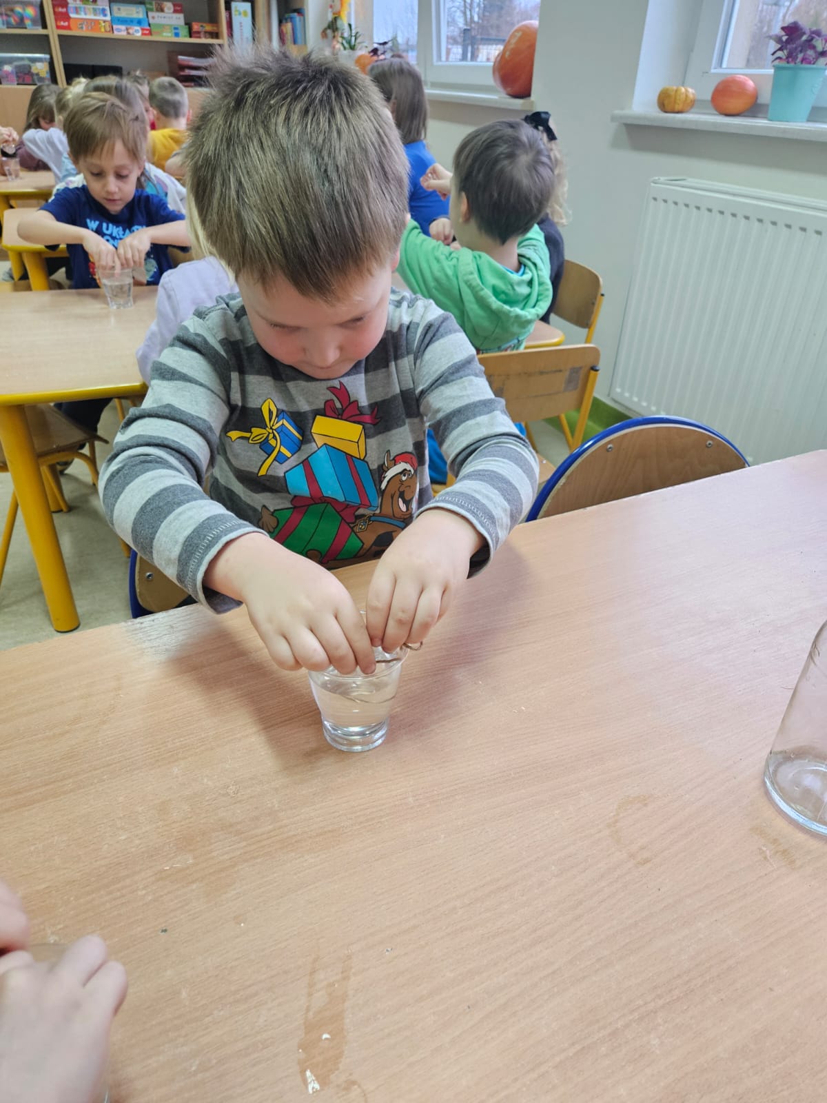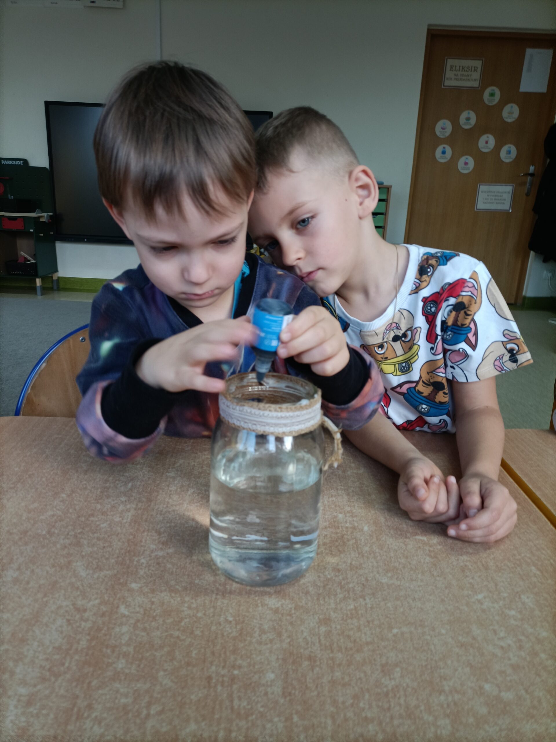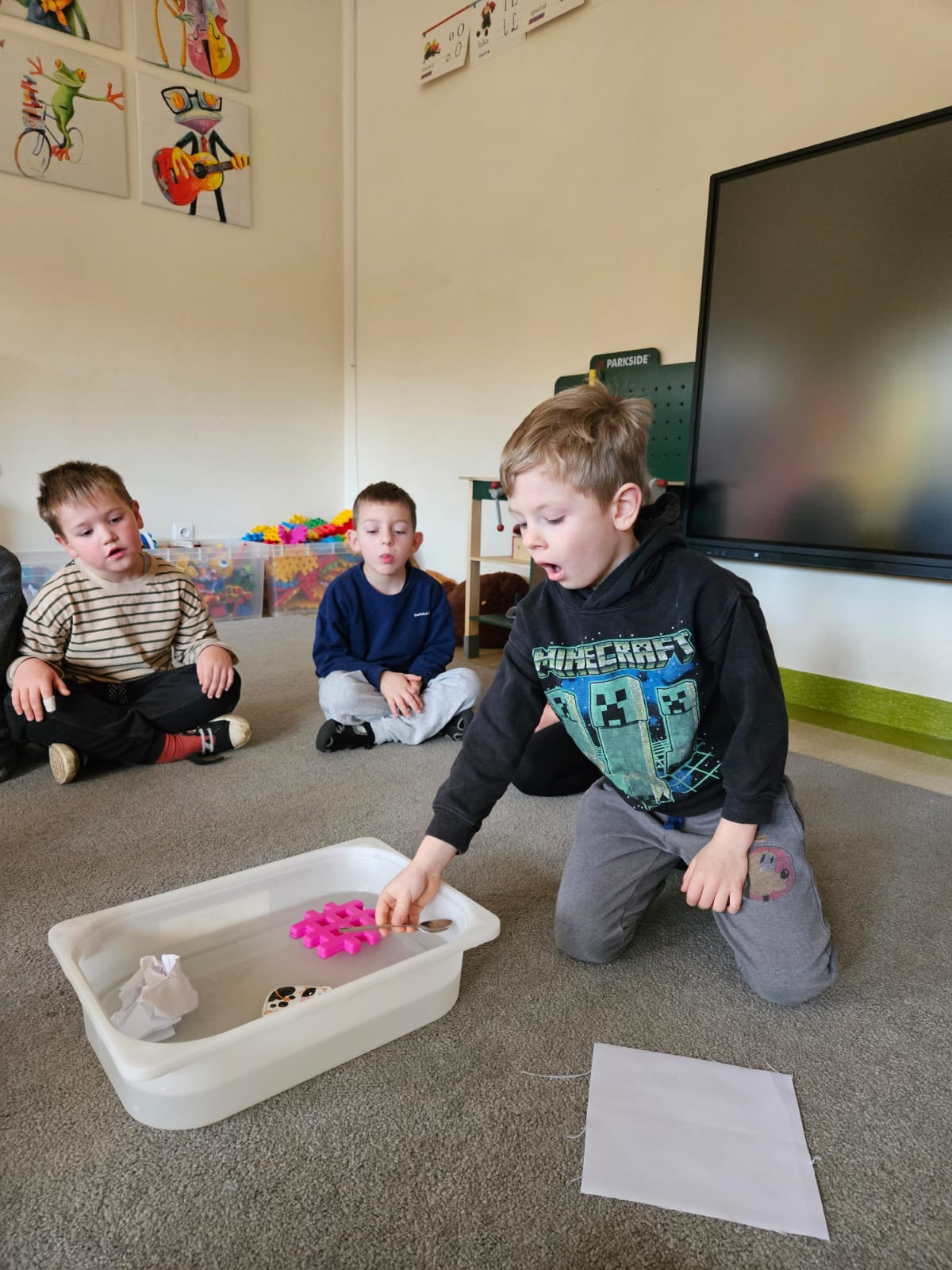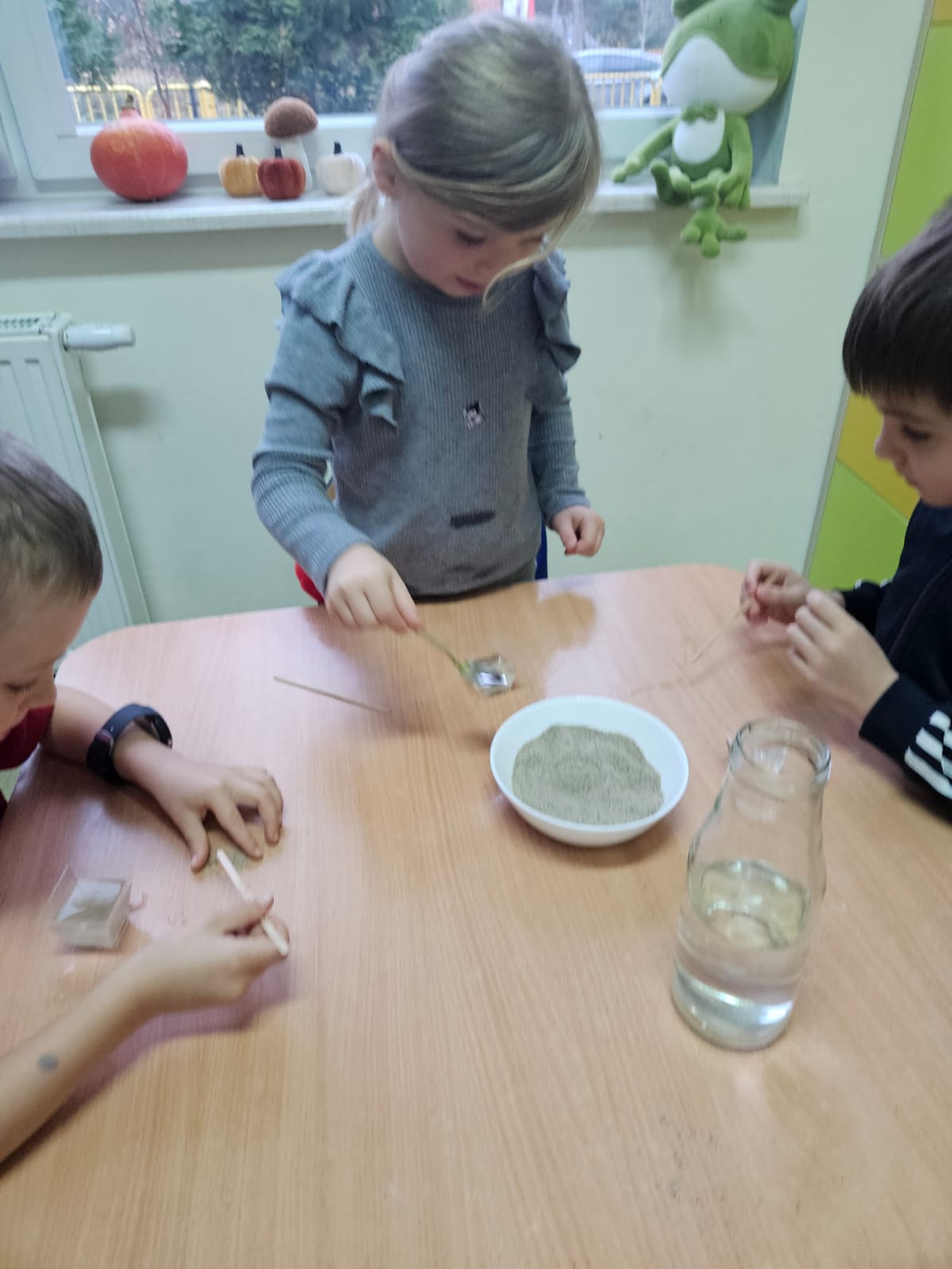Podczas I etapu projektu nasze Żabki badały różnorodne materiały i poszukiwały odpowiedzi na pytanie: skąd się bierze ropa naftowa? Dzieci zdobywały wiedzę na temat surowców mineralnych w Polsce, dowiadywały się, co jest z czego zrobione, a także poznawały materiały za pomocą wielu zmysłów. Szczególnym zainteresowaniem cieszyło się odkrywanie magii tkanin – ich faktur, właściwości i zastosowań. Podczas zajęć przeprowadzono wiele ciekawych eksperymentów z wodą, olejem, kolorami oraz różnymi materiałami, które rozwijały dziecięcą ciekawość, kreatywność i umiejętność obserwacji.