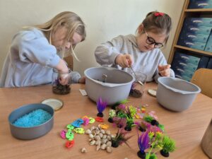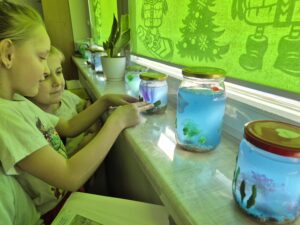 Podczas zajęć dzieci rozwijały swoją kreatywność, ćwiczyły precyzję oraz uczyły się cierpliwości. Tworzenie akwariów było nie tylko świetną zabawą, ale także okazją do rozmów o podwodnym świecie i jego mieszkańcach. Każda praca była wyjątkowa i niepowtarzalna – dokładnie tak jak jej autor.