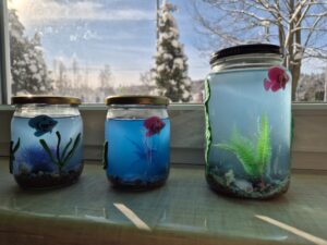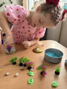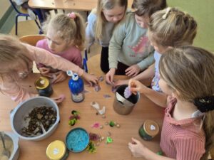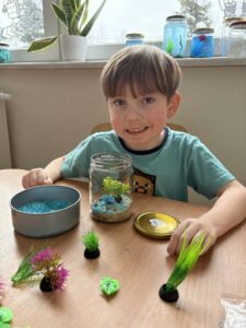 Tym razem dzieci przygotowały magiczne akwaria w słoikach, które wywołały prawdziwy efekt WOW! Każdy słoik zamienił się w mały, podwodny świat pełen kolorów, blasku i tajemniczych detali. W środku można było podziwiać mieniące się „wodne” przestrzenie, błyszczące rybki, muszelki oraz rośliny, które wyglądały jak zaczarowane.