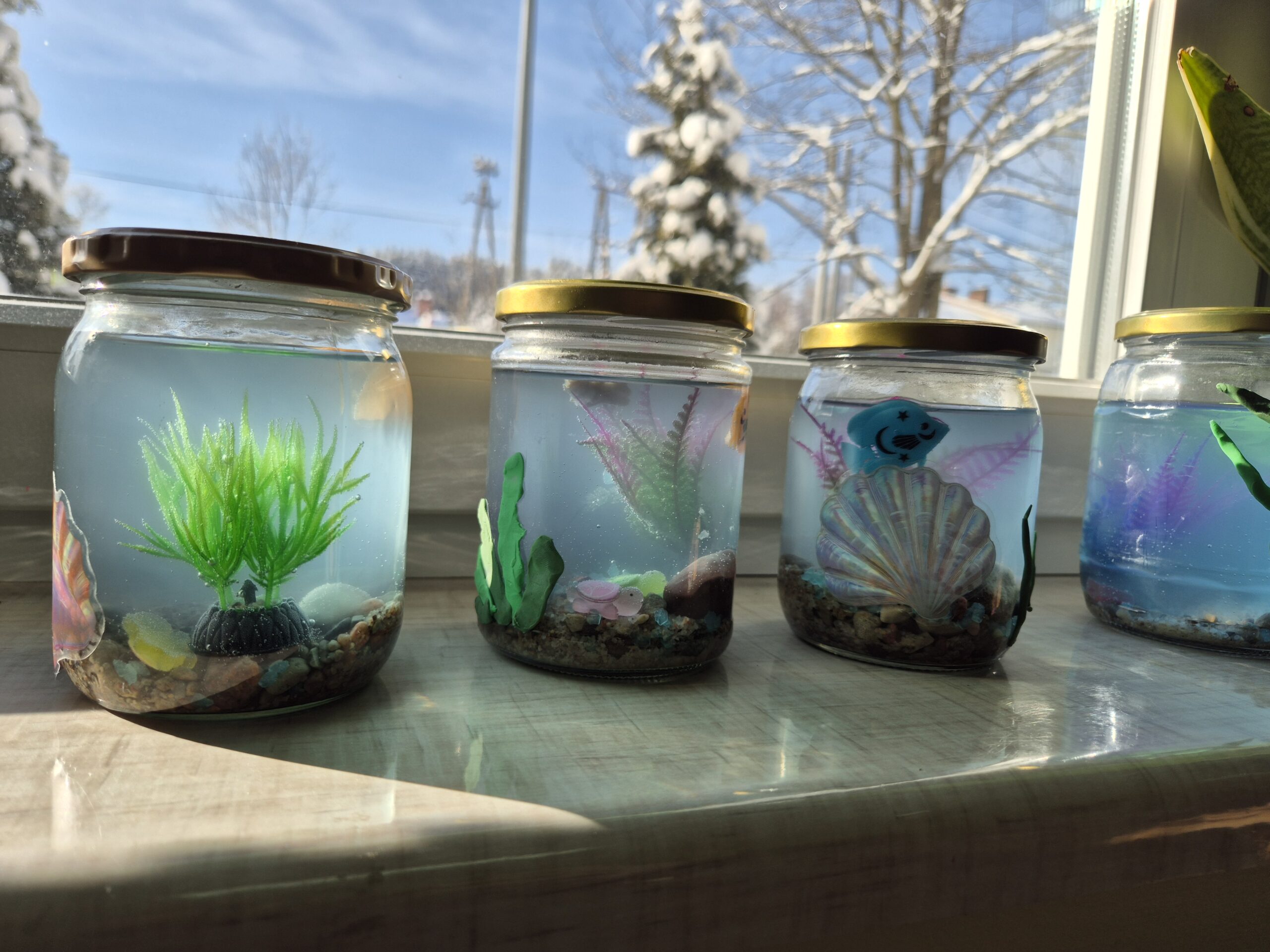 Tym razem dzieci przygotowały magiczne akwaria w słoikach, które wywołały prawdziwy efekt WOW! Każdy słoik zamienił się w mały, podwodny świat pełen kolorów, blasku i tajemniczych detali. W środku można było podziwiać mieniące się „wodne” przestrzenie, błyszczące rybki, muszelki oraz rośliny, które wyglądały jak zaczarowane.