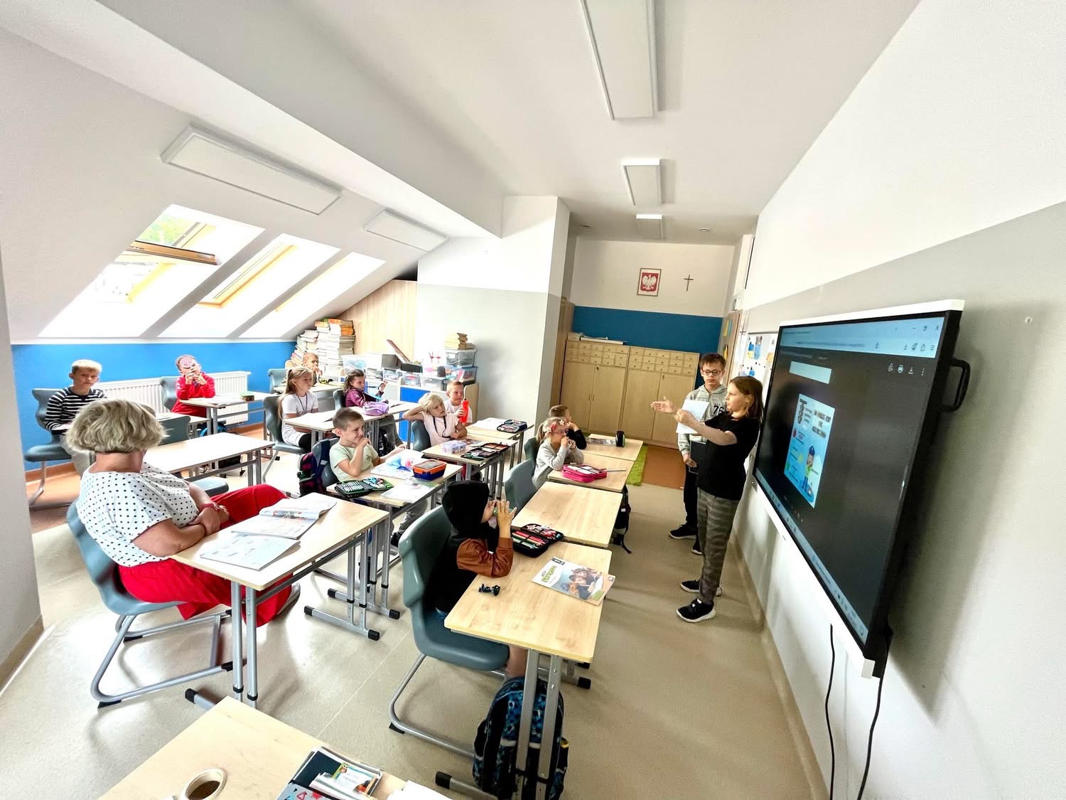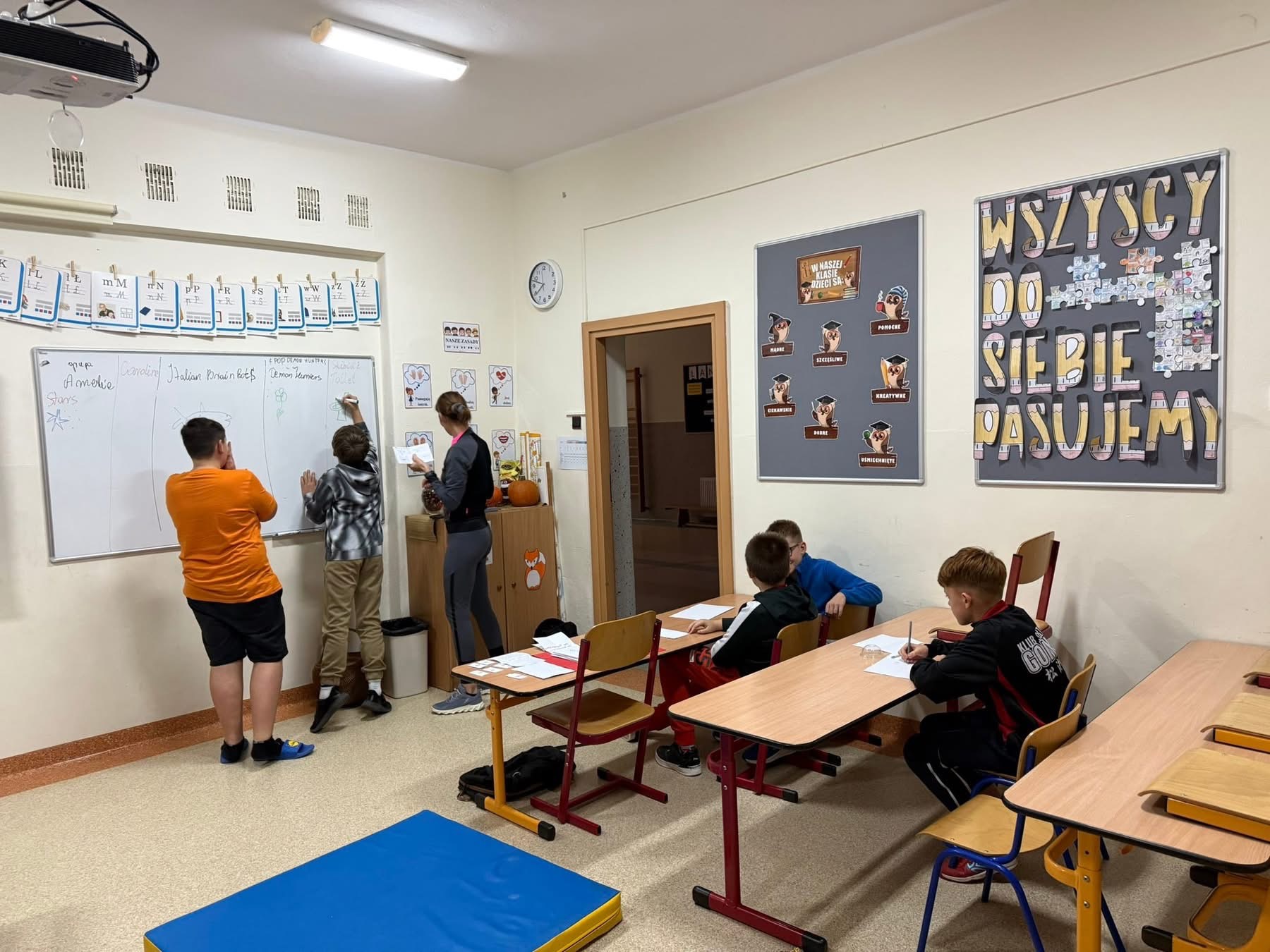 Uczniowie są zaangażowanie i udzielają odpowiedzi na lekcji poprzez podniesienie wcześniejsze ręki. Rozwiązują zadania z matematyki pojedynczo przy tablicy.